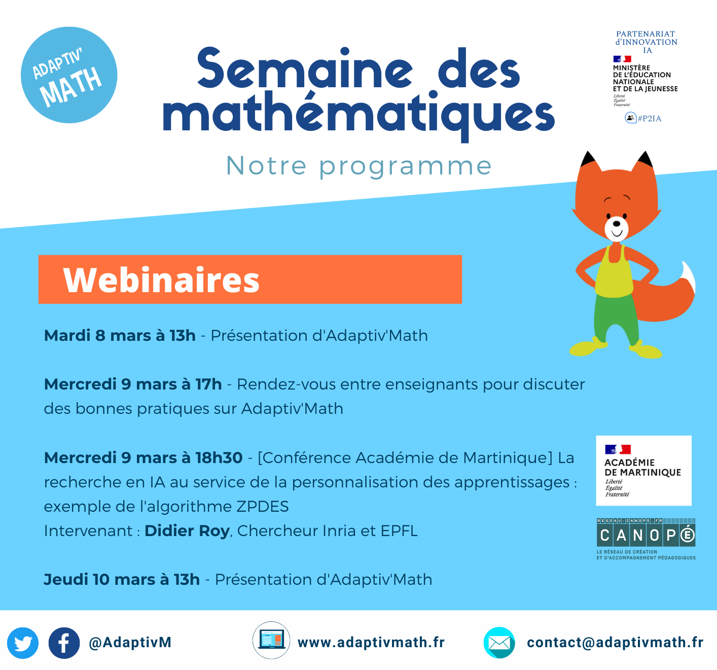 A l’occasion de la semaine des mathématiques nous vous avons concocté un super programme de webinaires et animations. Pour vous inscrire à l’un des webinaires cliquez ici : https://evidenceb.typeform.com/semainedesmaths